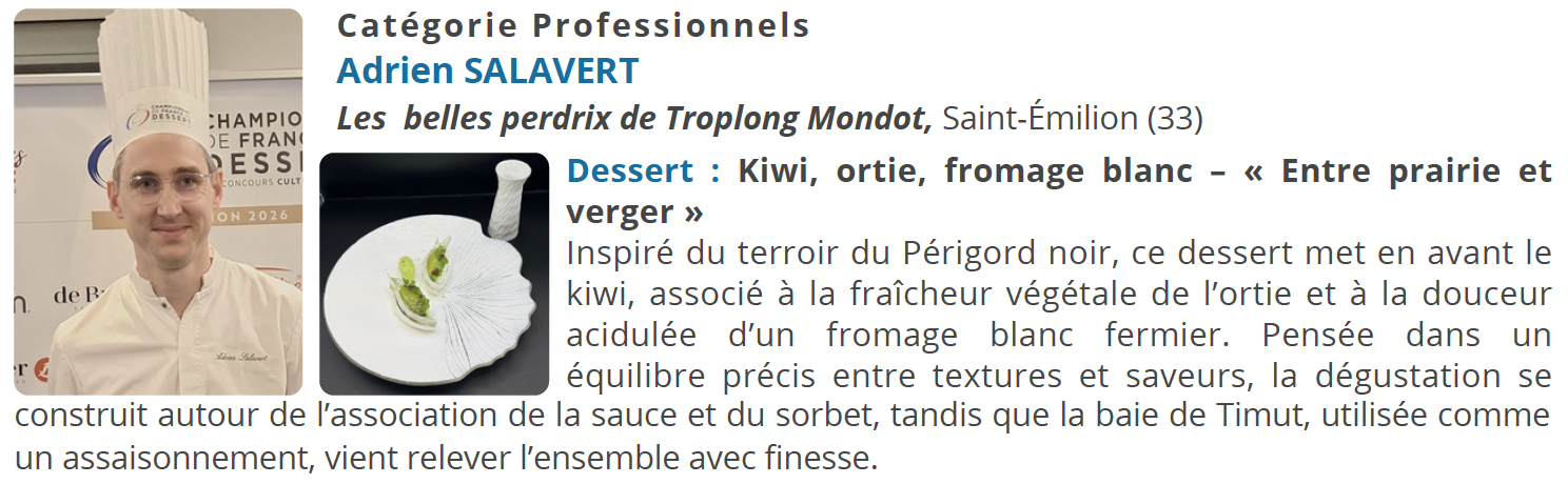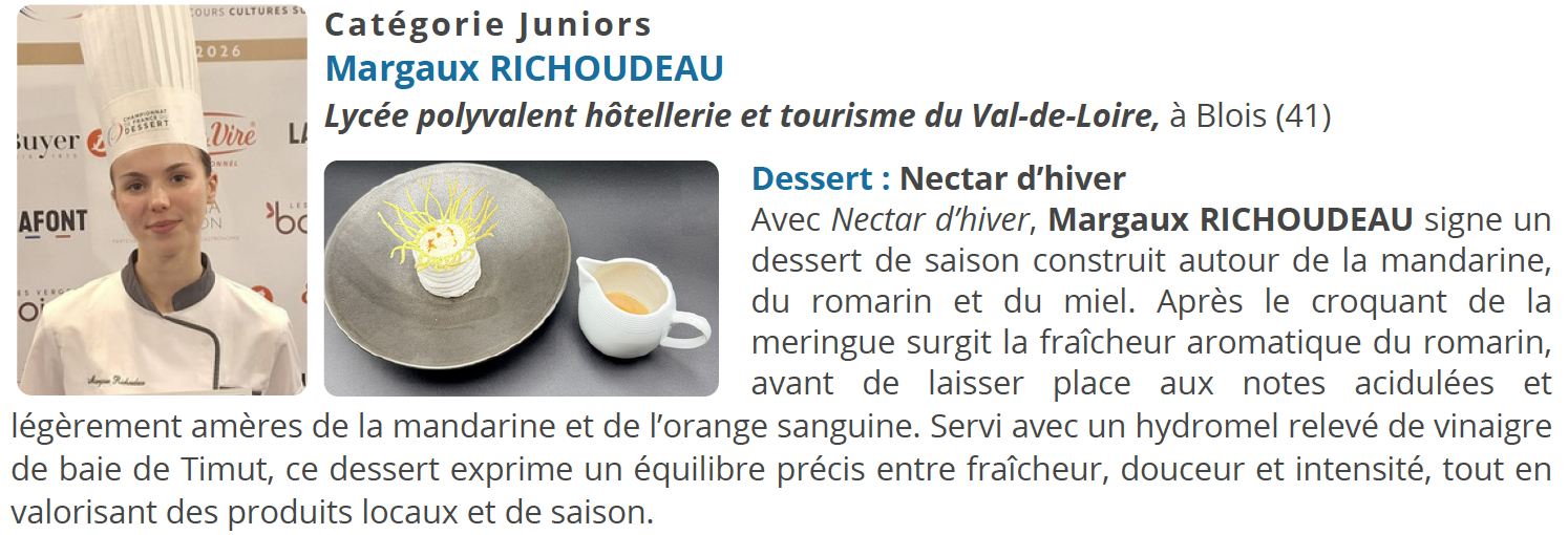 À l’issue de cette finale régionale, dans la catégorie Juniors, Margaux RICHOUDEAU - Lycée polyvalent hôtellerie et tourisme du Val-de-Loire, à Blois (41) et dans la catégorie Professionnels, Adrien SALAVERT - Les belles perdrix de Troplong Mondot, Saint-Émilion (33) se sont qualifiés pour la Finale Nationale du Championnat de France du Dessert 2026, prévue les 18 et 19 mars au lycée Jean-Baptiste Chardin, à Gérardmer (88), sous la présidence de Michaël BARTOCETTI, chef pâtissier du Four Seasons Hôtel George V, à Paris.